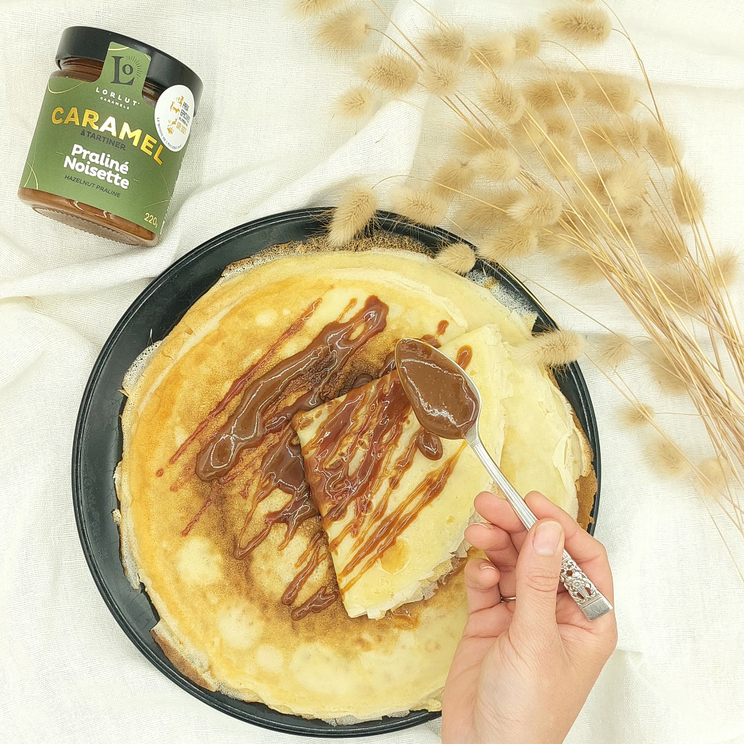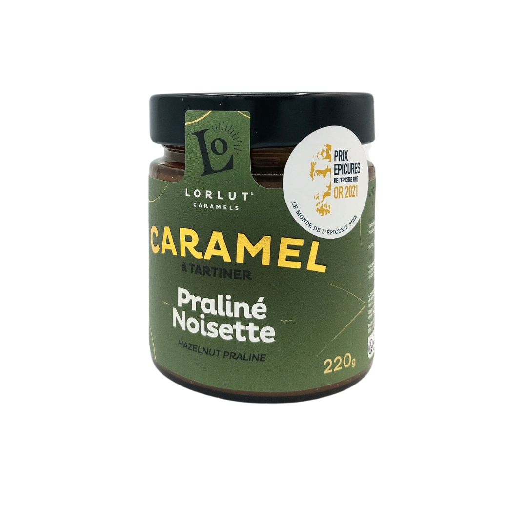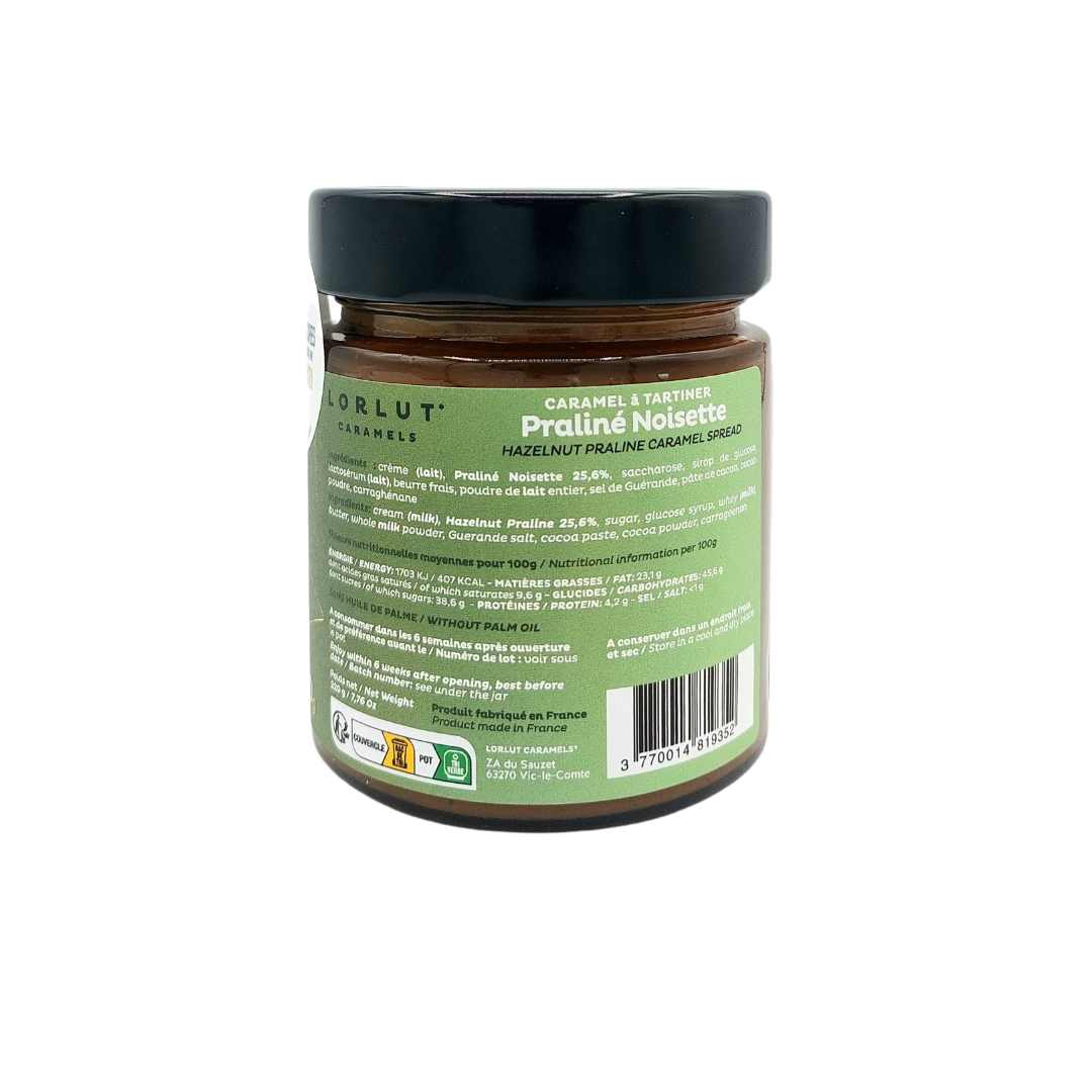 Ingrédients : crème (lait), praliné noisette 25,6%, saccharose, sirop de glucose, lactosérum (lait), beurre frais, poudre de lait entier, sel de Guérande, pâte de cacao, cacao poudre, carraghénane