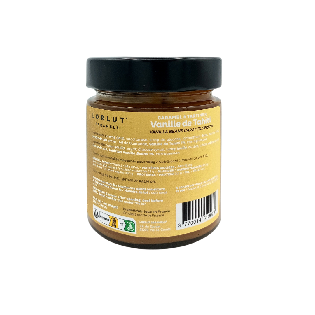 Ingrédients : crème (lait), saccharose, sirop de glucose, lactosérum (lait), beurre frais, poudre de lait entier, sel de Guérande, vanille de Tahiti 1%, carraghénane